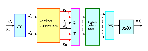 Dovendo testare il funzionamento dell'algoritmo di minimizzazione è stato introdotto nello schema a blocchi, il "Sidelobe Suppression" che implementa l'algoritmo per la minimizzazione dell'emissione fuori banda [5].
