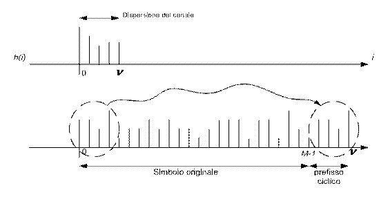 Nel programma usato per le simulazioni è implementata, come anticipato nel Capitolo I, l'inserzione del prefisso ciclico. Lo scopo è quello di compensare la dispersione temporale del canale selettivo, eliminando l'interferenza intersimbolica (ISI) tra i simboli (blocchi). Questa tecnica consiste nell'inserire un intervallo di guardia (della stessa durata del ritardo del canale) alla fine od all'inizio di ciascun blocco periodicamente. In realtà, si spezza in due parti l'intervallo di guardia, ponendone metà all'inizio è metà alla fine, per permettere l'estinzione delle code del blocco precedente e di quello successivo. Nell'intervallo di guardia alla fine del blocco viene ripetuto l'inizio del blocco stesso, in quello all'inizio ne viene ripetuta la coda. In fig.3 è schematizzata l'inserzione del post-fisso in coda, mentre in fig.4 l'inserzione del prefisso. Questa operazione avviene direttamente nel main non c'è una funzione dedicata.