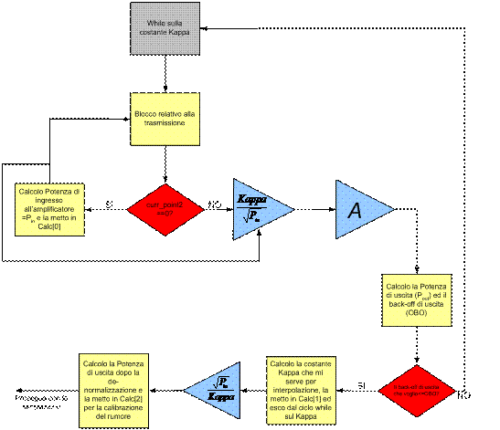 Scorrendo ulteriormente l'intestazione si incontrano i double Kappa e PassoKappa. Il primo indica il valore iniziale della costante moltiplicativa Kappa con il quale si attenua il segnale in ingresso all'amplificatore. Ad ogni ciclo la costante moltiplicativa Kappa viene scalata di una quantità PassoKappa fino ad ottenere il back-off desiderato. Si segnala il vettore double Calc di dimensione tre così composto: Calc[0] contiene la potenza media in ingresso all'amplificatore, Calc[1] è la costante che si deve utilizzare per moltiplicare la parte in fase ed in quadratura del segnale all'ingresso dell'amplificatore in modo da ottenere il back-off di uscita desiderato mentre Calc[2] è la potenza media in uscita all'amplificatore dopo tutte le operazioni di scalatura effettuate e dopo il ripristino della dinamica del segnale. Quindi una variabile double ind che indica il back-off di uscita che si vuole ottenere e la variabile intere camp cioè il numero di campioni effettivi su cui si calcolano tutte le potenze. Infine, restituisce l'intero monitor di flag. Per maggior chiarezza mostriamo lo schema a blocchi per il calcolo della potenza e di tutte le varie costanti di interesse per la simulazione