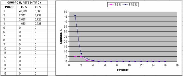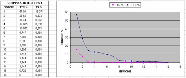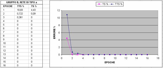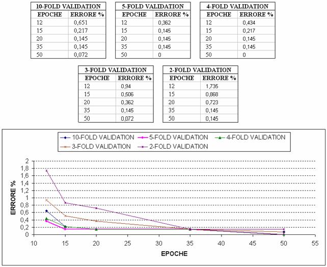 NOTA1: Il fatto che in ogni caso l'errore vada a zero e ci si stabilizzi supponiamo sia dato dal fatto che TTS e TS siano molto simili come distribuzione. Infatti, anche andando a variare di molto il numero di epoche (anche di vari ordini di grandezze) non si verifica overtraining cioè l'errore commesso sul TTS è sempre di 0%.