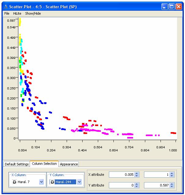 Applicando un Evaluator di tipo Wrapper Subset Eval e un algoritmo di ricerca di tipo Rank Search è stata individuata la feature Haral7. Prima di etichettarla come definitiva si è visto graficamente come tale features fosse mutuamente indipendente dalle singole features già selezionate (ma ciò non vuol dire che non possa essere indipendente da una qualsiasi loro combinazione). Ad esempio il grafico corrispondente alle features Haral7 e Haral244 è il seguente: