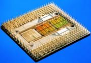 Il sofisticato Pentium Pro 200-MHz con 1-MB di cache integrata (notare i 3 die che lo compongono, quello della CPU da 5.5 milioni di transistor, a sinistra, e gli altri due die da 512-KB di cache ciascuno).