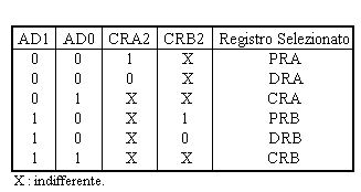 La Tabella 13, dove AD1 e AD0 sono i due bit meno significativi dell'indirizzo, mostra come selezionare i singoli registri; ad esempio, PRA e DRA hanno lo stesso indirizzo, ma è possibile selezionare uno dei due fissando prima il valore del bit 2 di CRA.. Poiché il dispositivo ha un bus ad otto bit, le sole operazioni di lettura o scrittura consentite sono quelle sul byte.