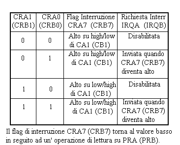 Controllo di CA1 (o CB1): CA1 consente di controllare il flag di interruzione IRQA1 presente nella parola di stato-controllo di 8 bit posto in posizione b7. In particolare, tale bit va alto a seguito della transizione attiva di CA1. Il flag è automaticamente resettato dalla lettura del registro dato da parte del processore. La transizione attiva è del tipo 1-0 se il bit b1=0, è del tipo 0-1 se b1=1. Lo stato del flag IRQA1 si ripercuote sulla linea di interruzione IRQA verso il processore, generando così, nel caso di transizione 1-0, una interruzione quando il bit b0=1. Se b0=0 tale trasmissione non è effettuata disabilitando così la generazione di interruzioni. Quanto detto per CA1 vale anche per CB1.