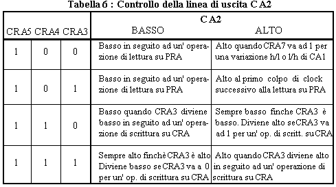 CA2 (o CB2) come linea di ingresso (b5=0): si comporta come CA1 con la differenza che il flag di interruzione interessato è IRQA2 ed i bit di programmazione sono b3 nelle funzioni di b0 e b4 nelle funzioni di b1. Quanto detto vale anche per CB2.