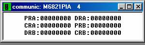 La finestra associata a M6821PIA ne mostra tutti i registri (Fig. 25); il valore di tali registri può essere modificato, oltre che da programma, utilizzando il comando Modifica Valore del menù Device. E' possibile ridirigere l'input e l'output verso file anziché verso una periferica con i comandi Input da File e Output su File del menù Device.