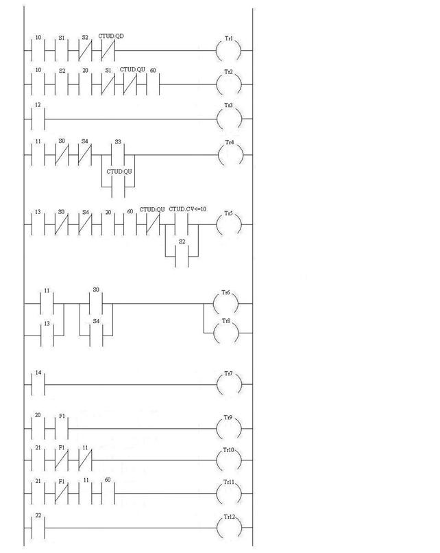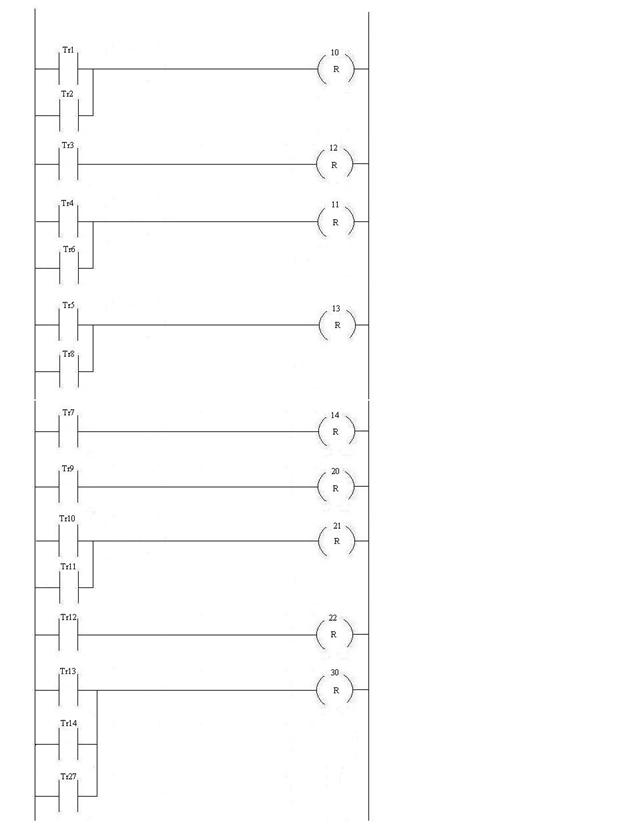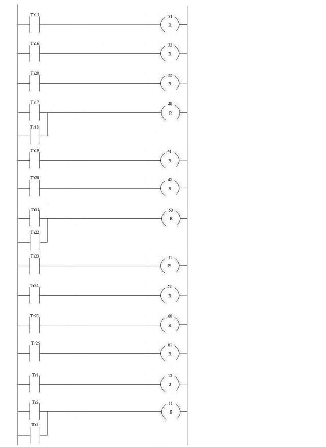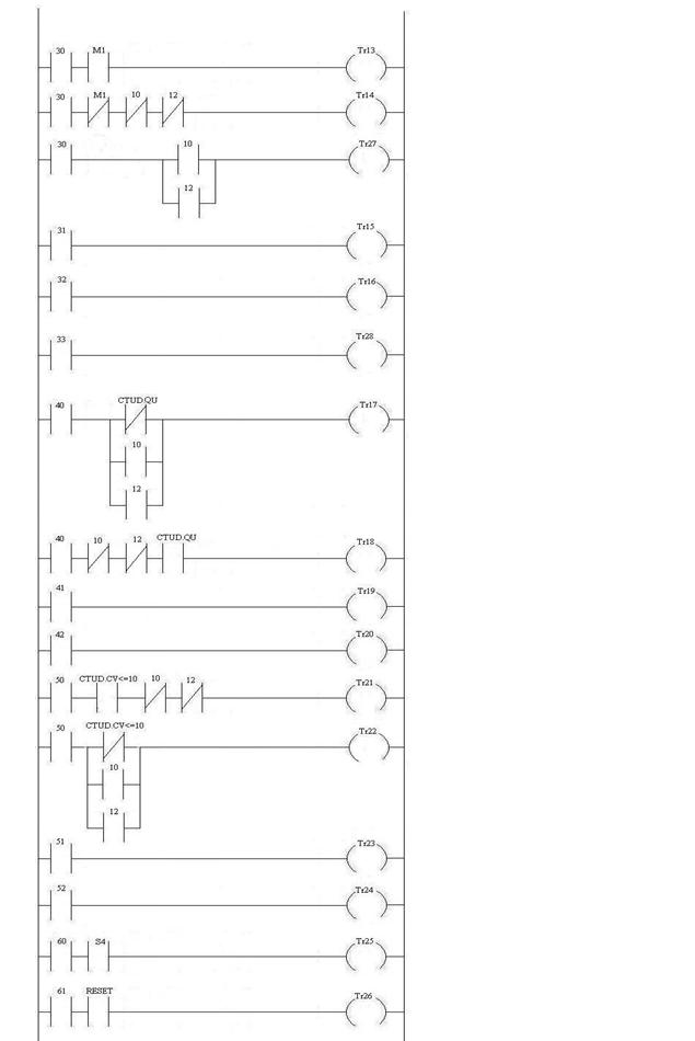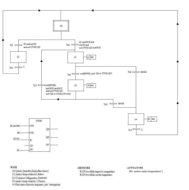 La pressione di S1 provoca l'azzeramento del contatore CTUD (attivazione fase 12). Come si può notare osservando l'espressione della transizione Tr1, tale operazione non può essere compiuta se CTUD.QD risulta valere true (1) in quanto il contatore già risulta azzerato. E' da notare che l'unica indicazione sul contenuto del magazzino ci è data dal contatore, se è necessario azzerare il contatore vuol dire che il magazzino deve essere stato svuotato manualmente. La transizione Tr3 è sempre verificata, la fase 12 si disattiva e ritorna ad essere attiva la fase 10.