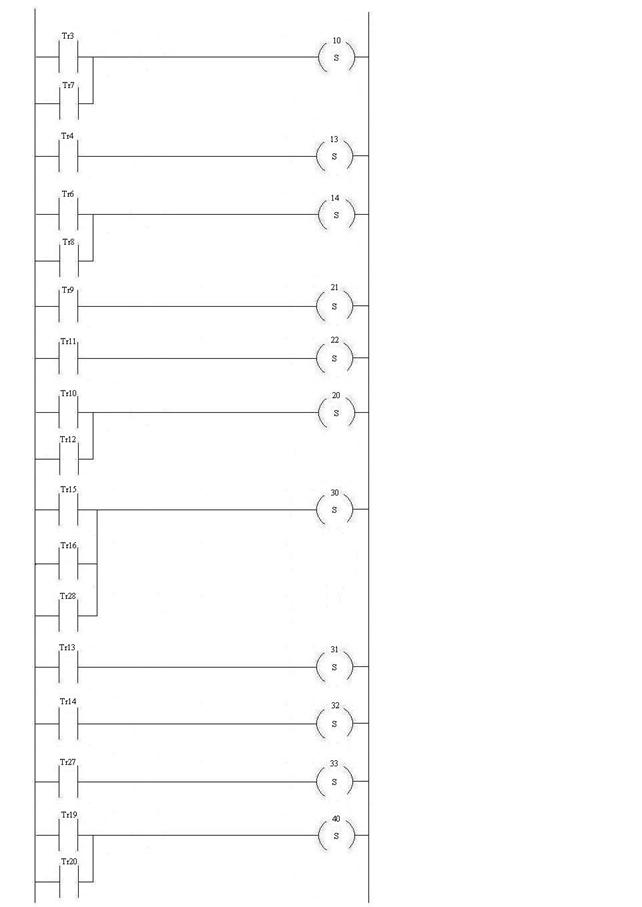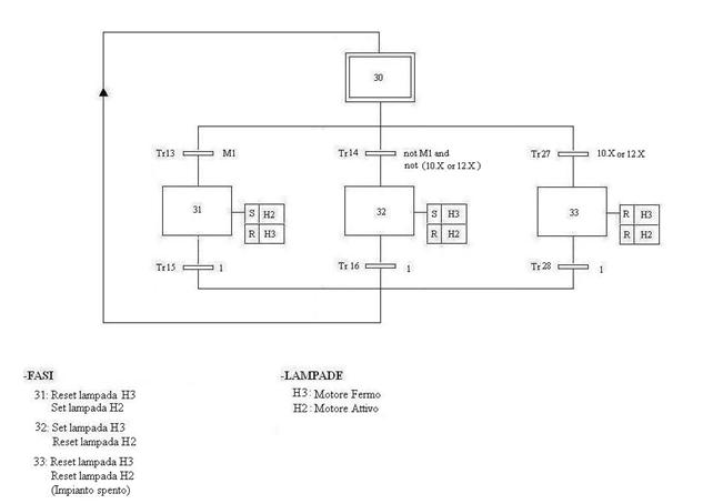 Se il motore è acceso la transizione Tr13 viene scavalca e attivata la fase 31 che prevede Reset di H3 e Set di H2. Viceversa se il motore è spento (not M1) viene superata la transizione Tr14 è attivata la fase 32 che setta H3 e resetta H2.