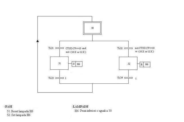 La fase 51 attivata dopo il superamento della transizione Tr21 (CTUD.CV<=10) porta in set la lampada H6 mentre la fase 52, attivata col superamento della transizione Tr22 (not CTUD.CV<=10), resetta la lampada.