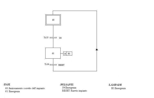 La fase 60 quando è attiva segnala che il sistema funziona correttamente e che l'ipotetico ciclo di lavoro può proseguire normalmente. Quando tale fase viene disattivata, ad opera della transizione Tr25, ovvero quando viene premuto S4 il pulsante di emergenza, l'SFC si porta nella fase 61 che prevede l'accensione della lampada H1.