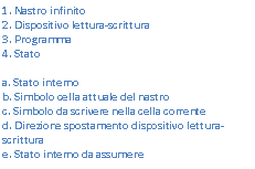 I programmi della macchina di Turing sono costituiti da un numero finito di istruzioni formate da cinque simboli: il primo è un numero naturale che indica lo stato interno della macchina; il secondo è un simbolo che può essere 0 o 1 e che indica il simbolo che si trova scritto nella cella corrente del nastro; il terzo può anch'esso essere 0 o 1 e indica il simbolo che dovrà essere scritto nella cella corrente del nastro; il quarto può essere la lettera S o D e indica la direzione in cui si dovrà spostare il dispositivo di lettura-scrittura, il quinto è un numero naturale e indica lo stato interno che deve assumere la macchina. Una volta scritto il programma da eseguire si posiziona il dispositivo di lettura-scrittura sulla cella che contiene il primo simbolo 1 a sinistra e si pone la macchina nello stato 0. Si avvia e si attende che si arresti da sola. Una volta fermata si considera come risultato della computazione il numero di 1 presenti sul nastro indipendentemente dalla loro posizione.