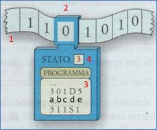 A questa prima risposta teorica, Turing ne aggiunse una più pratica ideando una macchina in grado di simulare il processo di calcolo che compie la mente umana scomponendola nei sui passaggi elementari. Questa macchina è composta da: un nastro illimitato, suddiviso in un numero infinito di celle, ognuna delle quali contiene uno dei due simboli 0 o 1; un dispositivo di lettura-scrittura, tramite il quale la macchina può leggere o modificare il contenuto di una sola cella; uno stato interno indicato con un numero naturale e finito; un programma scritto in un linguaggio semplice. La macchina agisce mediante il dispositivo di lettura-scrittura che può eseguire alcune operazioni elementari: scrivere il simbolo 0 o 1 nella cella su cui è posizionato; spostarsi di una sola cella a destra o sinistra; mutare il proprio stato interno.