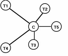 Un nodo centrale a cui sono connessi tutti gli altri. Tutti i messaggi devono passare per il nodo C, che provvederà a smistarli. Se cade un collegamento il nodo è isolato Inesistente il rischio di collisioni. Il nodo C prende il nome di server, gli altri di client ( architettura client-server) Il malfunzionamento del server blocca l'intera rete. Ogni nodo può trasformarsi in un server di livello inferiore. Nella topologia a stella connessa il server può essere collegato ad altro server |