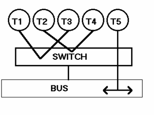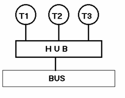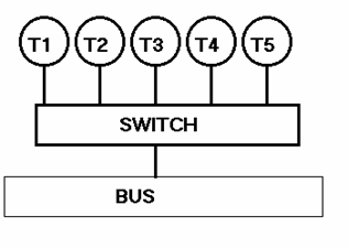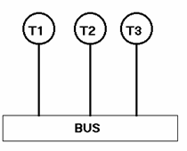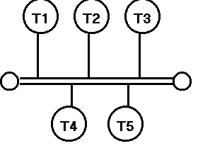 Tutti i nodi sono connessi ad un unico mezzo trasmissivo lineare, il bus, percorribile in entrambi i versi. Ogni pacchetto viene preceduto da un gruppo di bit che indica il destinatario. Il pacchetto viene ricevuto e analizzato da tutti i nodi, ma solo la stazione il cui codice corrisponde al gruppo di bit di testa lo accetterà. Il controllo può avvenire via hardware, con porte logiche, o via software, mediante il controllo dei byte ricevuti dalla chiamata dell'interrupt. Nella topologia a bus il segnale viene inviato solo dopo aver controllato se la linea è libera: me nell'intervallo di tempo tra risposta 'linea libera' e invio del messaggio un'altra stazione può aver trasmesso. In questo caso si crea una collisione. Agli estremi del bus vi sono i nodi terminatori, ad evitare che il segnale torni indietro creando collisioni. |