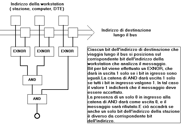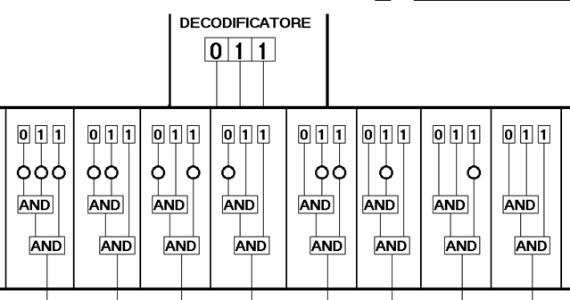 Il controllo dell'indirizzo via hardware può avvenire secondo il principio illustrato nello schema, limitato a 3 bit per semplicità ma facilmente estendibile