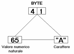Il byte in esadecimale sono i bit che effettivamente sono in memoria, trascritti in esadecimale per comodità di lettura. Il valore numerico naturale è il numero associato al BYTE, se interpretato come numero in base 2 ( o base 16 ) Il carattere ASCII e' il carattere associato al BYTE nel codice ASCII |
