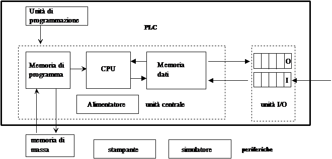 Nella figura è illustrato lo schema a blocchi dell'hardware di un PLC. Essa, oltre a dare un quadro riassuntivo di quanto detto circa gli elementi componenti, mette in evidenza il percorso delle informazioni