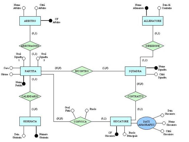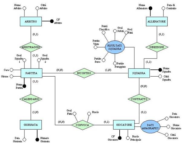 Per ogni giornata del campionato si vogliono sapere i punti relativi a ogni squadra, i giocatori di ogni squadra che hanno effettivamente giocato ed in che ruolo. Per ogni partita, si vuole tenere traccia dell'arbitro, caratterizzato dal nome, e dalla città di nascita.