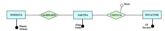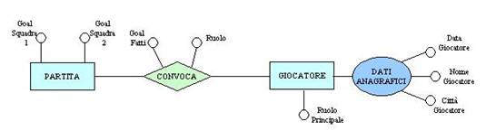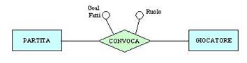 L'entità partita e l'entità Giocatore sono messe in relazione attraverso la relazione Convoca, la quale permette di rappresentare quei giocatori che hanno effettivamente partecipato ad una determinata Partita, nonché fornire l'informazione sul ruolo da essi avuto e gli eventuali goal effettuati.
