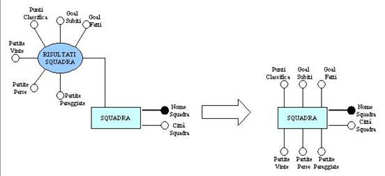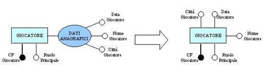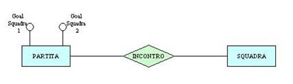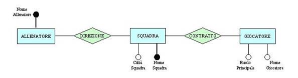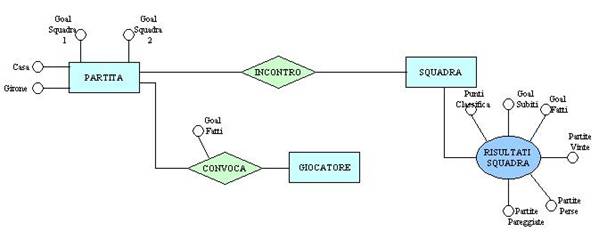 Per giungere a questo schema prima di tutto si è considerata la Squadra come un'entità: essa è collegata alle entità Giocatore, Allenatore e Partita. Supponendo che la squadra possa avere un allenatore differente col passare del tempo, si è schematizzato esso stesso come un'entità, piuttosto che come un semplice attributo.