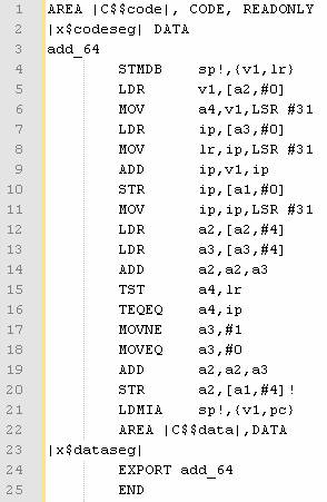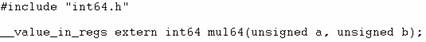 In questo caso è stata utilizzata la parola chiave __value_in_regs per consentire al programma di inserire all'interno della variabile a1 ed a2 la parte bassa e la parte alta del risultato inserito all'interno del parametro di ritorno della funzione. Per quanto riguarda int64.h, ancora una volta questo file è identico a quello riportato in Figura 5.