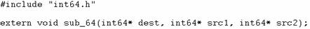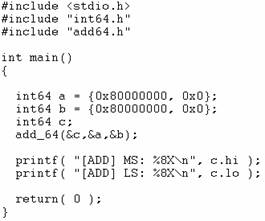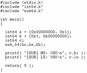 Il codice di int64.h corrisponde perfettamente con quello riportato in Figura 5. Mentre il codice per testare la sottrazione a 64 bit è riportato di seguito: