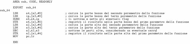 Come nel caso dell'addizione, tramite l'uso dei parametri a e b è possibile specificare rispettivamente, prima la parte bassa e poi la parte alta del numero che si intende sottrarre. Il risultato viene poi posto in c e visualizzato in output sul monitor.