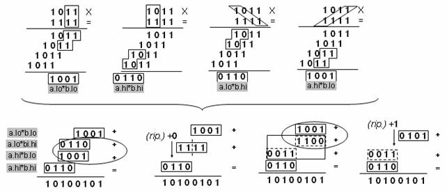 Come è possibile notare, si estraggono 4 numeri contenuti in registri da 4 bit ciascuno che rappresentano la somma delle quantità evidenziate in figura. Una volta che queste 4 quantità sono state estratte si effettuano una serie di operazioni di manipolazione al fine di produrre un risultato analogo a quello che si avrebbe se si effettuassero le operazioni tipiche di una moltiplicazione classica.