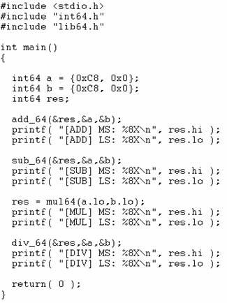 Il codice relativo al file int64.h è, ancora una volta, del tutto simile a quello riportato in Figura 5. Mentre, per quanto concerne il file che è stato utilizzato per testare l'applicazione, è riportato nella seguente figura.