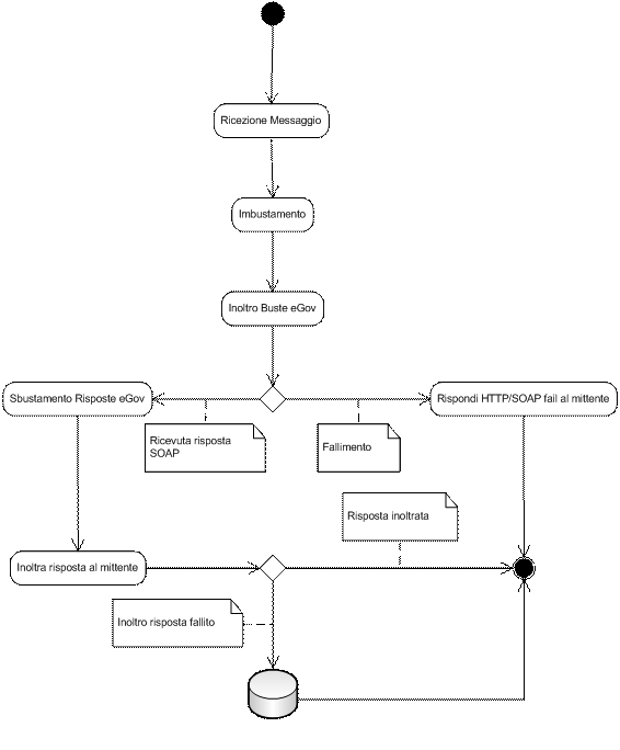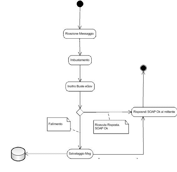 E' importante notare che il processo è thread-based, in contrapposizione con il processo tradizionale basato sui principi dell'architettura SEDA. Quindi tutta la logica viene svolta da un unico processo nella sua interezza. Ricevuto un messaggio SOAP questo viene imbustato trasformandolo in una Busta eGov e inoltrata alla Porta di Dominio Destinataria. Qualora si verificasse un problema di comunicazione, il sistema procede alla presa in consegna del messaggio, salvandolo su database e costruendo le informazioni necessarie per l'inoltro da inserire nella coda JMS InoltroBusteEGov. Logicamente, quindi, il messaggio passa dal canale preferenziale al canale tradizionale, sfruttandolo per garantire la persistenza dei messaggi. Il lavoro svolto negli stadi fin qui attraversati viene conservato nel processo di transizione da un canale all'altro. I messaggi gestiti dal canale preferenziale non attraversano code JMS, quindi non si accodano ai messaggi in transito. Questo ha due implicazioni: non introduciamo l'overhead dovuto al frazionamento del processo di mediazione e riduciamo drasticamente il numero di accessi a database per salvare le informazioni sullo stato del messaggio, ma rinunciamo a eventuali politiche di load balancing o di priorità.
