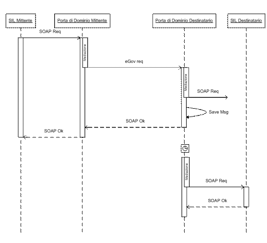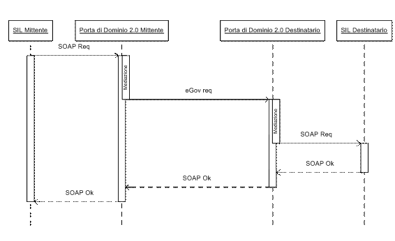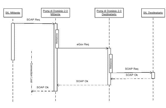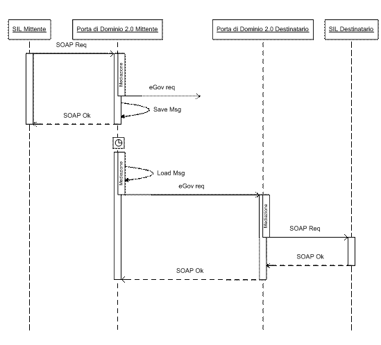 Come si nota dal diagramma di sequenza, in caso di successo il SIL Mittente non riceve subito l'ack SOAP dalla Porta di Dominio. La comunicazione quindi viene sospesa in attesa che il processo di mediazione sia portato a termine, al contrario del canale tradizionale che, a seguito della ricezione del messaggio, si occupava subito della presa in consegna e comunicava al mittente l'ack SOAP di conferma. In questo scenario non viene fatto nessun accesso a database, quindi, nel complesso, il processo di mediazione risulta più snello e rapido. Di contro, sarà chi invia il messaggio a dover attendere un tempo maggiore prima di ricevere la conferma SOAP, quindi, localmente, il processo risulta più lento.