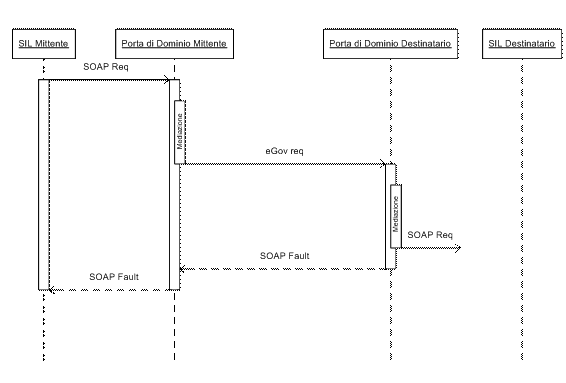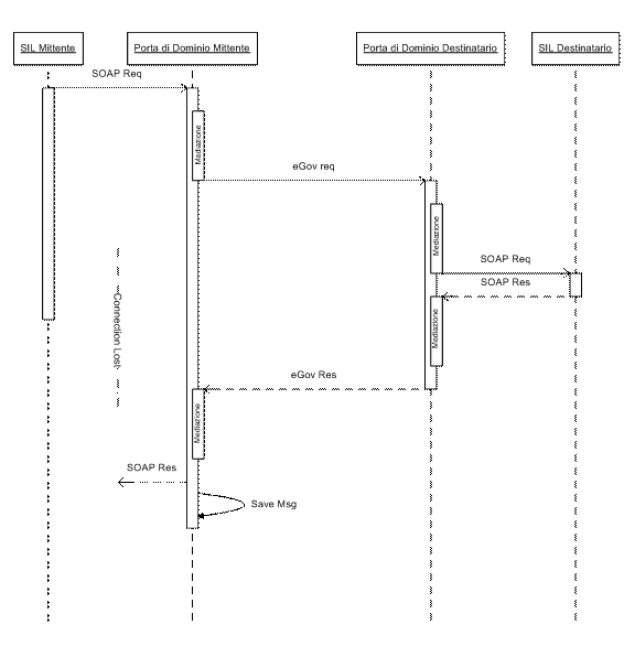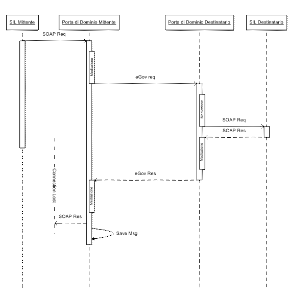 Qualora si verificassero degli errori di comunicazione, il sistema provvede alla presa in consegna del messaggio. Il messaggio viene quindi salvato su Database effettuandone la presa in consegna. Infine viene inviato l'ack SOAP al SIL Mittente. Quando la comunicazione riprenderà, i nodi successivi potranno ancora sfruttare il canale preferenziale, confermando la totale trasparenza del servizio agli altri nodi.