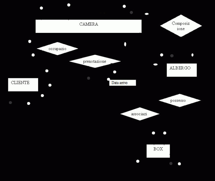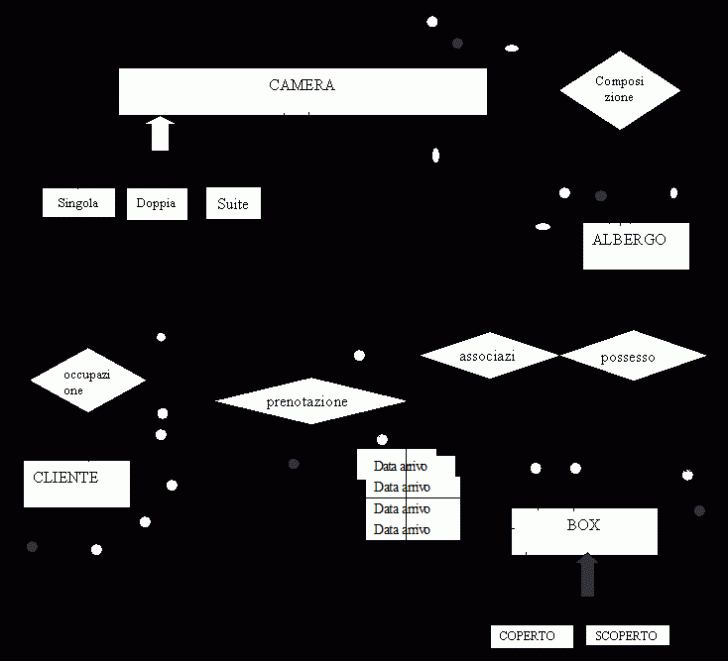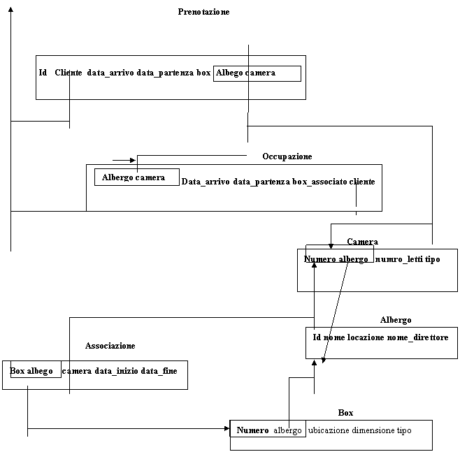 Per le prenotazioni (circa 500), si rappresenta un codice per identificarlo, il cognome del cliente la data di inizio e la data di fine del periodo di pernottamento, il numero della camera e l'eventuale numero box |