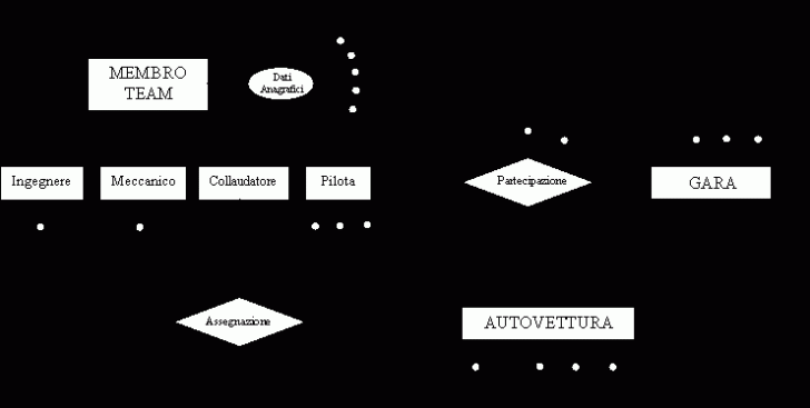 Ogni membro del team è caratterizzato da un codice, da un nome e dai dati anagrafici. Per gli ingegneri e i meccanici del team si vuole tenere traccia della loro specializzazione, mentre per i collaudatori si vuole tenere traccia delle autovetture a loro assegnate per il collaudo. Si suppone che un collaudatore collaudi sempre la medesima macchina. Per i piloti si vuol tenere traccia del numero di vittorie complessivo nella loro carriera, nonché del numero di campionati mondiali vinti. Un pilota non può essere contemporaneamente anche un collaudatore.