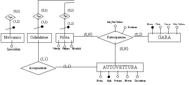Ogni gara è contraddistinta dal nome (es. 'G.P. Italia'), dal luogo in cui si svolge (es. Monza) e dalla data. Si vuole tenere traccia della partecipazione di un pilota ad una data gara, che si suppone avvenga guidando una e una sola macchina. Tuttavia, in gare diverse, un pilota può guidare auto diverse. Inoltre, si vuole tenere traccia dell'eventuale vittoria di un pilota del team in una determinata gara. Per ogni gara, si vuole tenere traccia del giro veloce, registrando anche il tempo ottenuto. Nel caso in cui il giro veloce sia stato ottenuto da un pilota del team, se ne vuole tenere traccia.