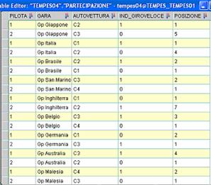 Per i piloti si vuol tener traccia del numero di vittorie complessive in carriera, del numero di campionati vinti, della partecipazione ad una data gara, che si suppone avvenga guidando una sola autovettura. In gare diverse un pilota può guidare auto diverse. Si deve tenere traccia delle eventuale vittoria di un pilota del team in una gara, e qualora effettui il giro veloce se ne vuol tenere traccia.