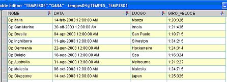 Ogni gara è contraddistinta dal nome, luogo e data. Per ogni gara si deve tener traccia del giro veloce registrando il tempo ottenuto.