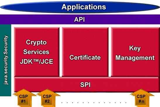 La versione standard della Sun Microsystem per l'ambiente runtime di Java viene fornita con un provider di default, chiamato SUN. Questo provider è integrato nella versione attuale del JDK. Ambienti runtime di Java di altri fornitori potrebbero non supportare gli stessi provider di default. I package del provider SUN includono l'implementazione per molte funzionalità di crittografia classica, come l'algoritmo DSA per la firma digitale e per la creazione delle coppie di chiavi, gli algoritmi MD5 e SHA-1 per il calcolo del digest, l'implementazione di un algoritmo di generazione di numeri pseudo-random, SHA1PRNG, e l'implementazione degli algoritmi per la gestione dei certificati e delle catene di certificati. Come è facile notare, non tutte le funzionalità della crittografia sono implementate dal provider SUN, ed inoltre non tutte le funzionalità fornite sono completamente sviluppate. Questo fatto ha portato alla Java Cryptography Extension (JCE) .