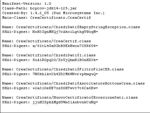 In questo comando è da mettere in evidenza la creazione del file manifest, il quale conterrà tutte le firme delle varie classi, che vengono create in automatico dal comando jar. Un esempio di contenuto del file manifest, anche questa volta preso da un caso reale, sempre relativo alla stessa Applet, è riportato di seguito: