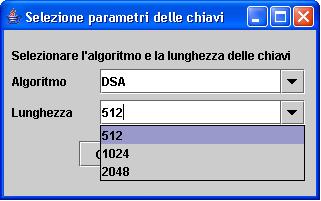 Naturalmente all'utente non è preclusa a priori la possibilità di scegliere una chiave di tipo DSA di lunghezza 2048 bit, ma qualora un utente selezionasse questa combinazione verrebbe generata un'eccezione, il cui unico compito è quello di informare l'utente della non corretta selezione dei parametri, tramite una finestra di dialogo, che per la precisione è creata con un oggetto di tipo JOptionPane. Un oggetto di questo tipo ha come scopo proprio quello di creare finestre di dialogo per la comunicazione di particolari eventi all'utente, fornendo anche la possibilità di inserire delle icone nel messaggio per una spiegazione anche visiva di quello che è il tipo del messaggio. Un oggetto JOptionPane fa parte del package javax.swing, e presenta alcune costanti che ne permettono la personalizzazione a seconda del tipo di messaggio e dell'azione che consegue alla notifica del messaggio. Infatti tramite un oggetto di questo tipo è anche possibile porre all'utente una domanda con delle opzioni di scelta.