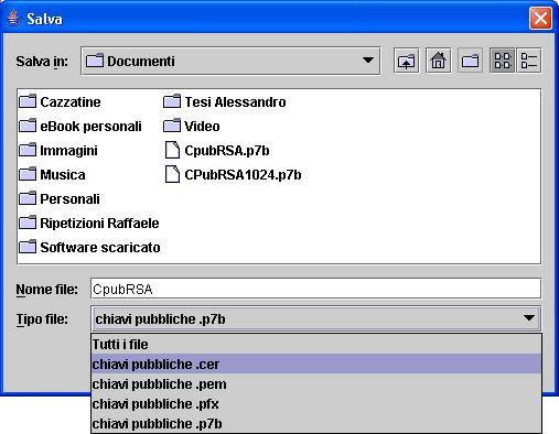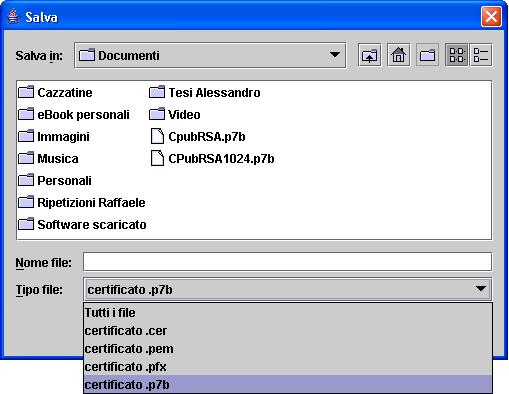 Per l'operazione di salvataggio del certificato, a differenza di quanto avveniva per la coppia di chiavi non è previsto alcun nome di default da assegnare al file. Le estensioni associabili al file contenente il certificato sono le stesse delle chiavi pubbliche, viste in precedenza.