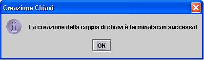 Una volta completata tutta la procedura di acquisizione delle informazioni dall'utente si passerà alla procedura di salvataggio vera e propria, che consisterà nella codifica in Base64 di entrambe le chiave. Per la chiave privata invece viene eseguita anche una cifratura con password proprio come descritto nel Capitolo 2 , nel paragrafo relativo. Alla fine della procedura di creazione della coppia di chiavi, verrà visualizzata una finestra di dialogo che notificherà l'avvenuta creazione delle chiavi, come mostrato in Figura 3‑ :