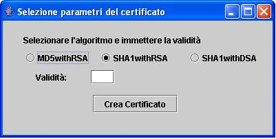 Siccome abbiamo pensato di suddividere il progetto in quattro Applet per mantenere ogni servizio indipendente degli altri il più possibile, ci è sembrato logico far creare autonomamente,a questa Applet, le chiavi pubbliche e private necessarie per la creazione e la firma del certificato. Infatti una volta che l'utente ha acconsentito a far eseguire l'Applet per la creazione di un certificato autofirmato, la prima cosa che viene chiesta all'utente è la selezione della durata della validità dello stesso e l'algoritmo da utilizzare per la creazione delle chiavi e la firma del certificato, tramite una finestra come quella mostrata in Figura 3‑ :