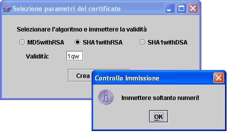 Sono possibili solo due scelte tra tutte le combinazioni di algoritmi di creazione delle chiavi e di firma; questo sempre per cercare di rendere meno difficile la scelta ad un utente poco esperto e poi perchè sono anche le combinazioni maggiormente utilizzate in crittografia. Per quanto riguarda la durata della validità del certificato, questa deve essere un numero positivo e non può prevedere nessun tipo di altro carattere. Infatti viene eseguito un controllo sulla consistenza del dato inserito e in caso di errata immissione viene lanciata un'eccezione il cui scopo è quello di avvisare dell'errore e consentire all'utente di ripartire, come mostrato in Figura 3‑ :