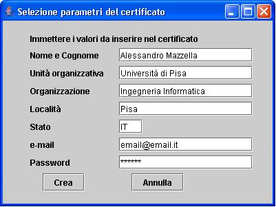 Quindi a questo punto sono disponibili le chiavi asimmetriche ma mancano le informazioni relative all'utente. Siccome il certificato è autofirmato, il proprietario è anche colui che lo rilascia, quindi i campi Subject e Issuer presenti nel certificato in formato X.509 sono identici. Questo campo viene costruito tramite le informazioni prelevate dalla seconda finestra di dialogo mostrata all'utente in cui si chiede di inserire i propri dati personali, che faranno parte delle informazioni contenute nel certificato. Queste informazioni sono quelle mostrate in Figura ‑ :