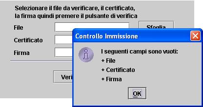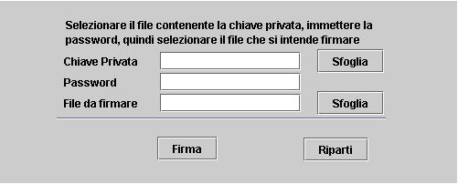 In questa Applet, come possiamo notare da quanto mostrato in figura, è possibile inserire ogni campo tramite il pulsante "Sfoglia" che permete l'ispezione del file system della macchina locale; questo implica che in qualche modo l'utente deve aver ricevuto i dati ed esserseli salvati sulla propria macchina.