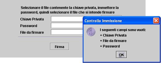 A questo punto devono essere inseriti i valori all'interno dei campi. L'Applet effettua un controllo sul corretto inserimento dei valori all'interno dei campi. Nel caso in cui alcuni campi rimanessero vuoti al momento della pressione del pulsante di firma, verrebbe generata un'eccezione per la notifica dell'assenza di dati nei campi, come riportato in Figura ‑ :