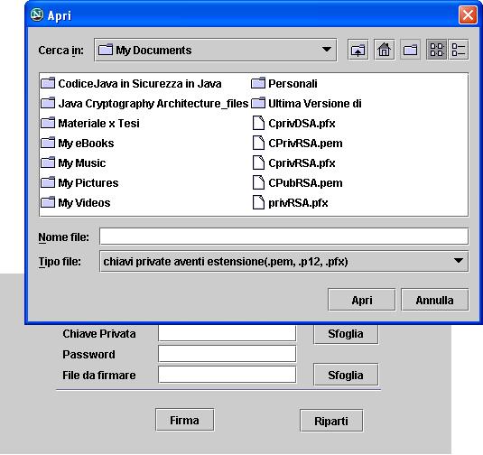 Per poter immettere un path di un file all'interno dei campi è stata prevista la presenza di pulsanti per l'apertura di finestre di dialogo che permettono la navigazione all'interno del file system della macchina locale. Per quanto riguarda la selezione della chiave privata, la navigazione nel file system è stata filtrata ai soli file che hanno estensione .pem, .pfx o .p12, come mostrato in Figura ‑ :