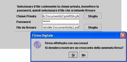 Quindi, effettuata la firma, se tutto è andato a buon fine, viene visualizzata un finestra di dialogo per informare l'utente di quanto accaduto e per chiedere se intende avere un resoconto del processo di firma. Per far fare all'utente questa scelta è stato utilizzato un oggetto JOptionPane, proprio come si era fatto per l'Applet di creazione delle chiavi. La finestra di dialogo si presenterà all'utente come mostrato in Figura ‑ :