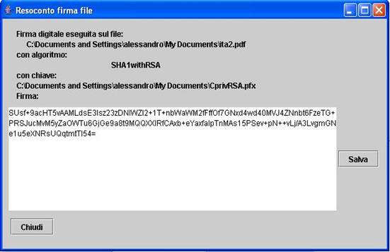 Nel caso in cui l'utente decida di avere un resoconto del processo di firma appena terminato si troverà davanti una schermata in cui sono riassunti tutti i dati più importanti quali l'algoritmo di firma utilizzato, la posizione, sulla macchina locale, in cui è posto il file con la chiave privata e una casella di testo in cui è posta la firma del file in formato codificato Base64, proprio come è mostrato in Figura ‑ :